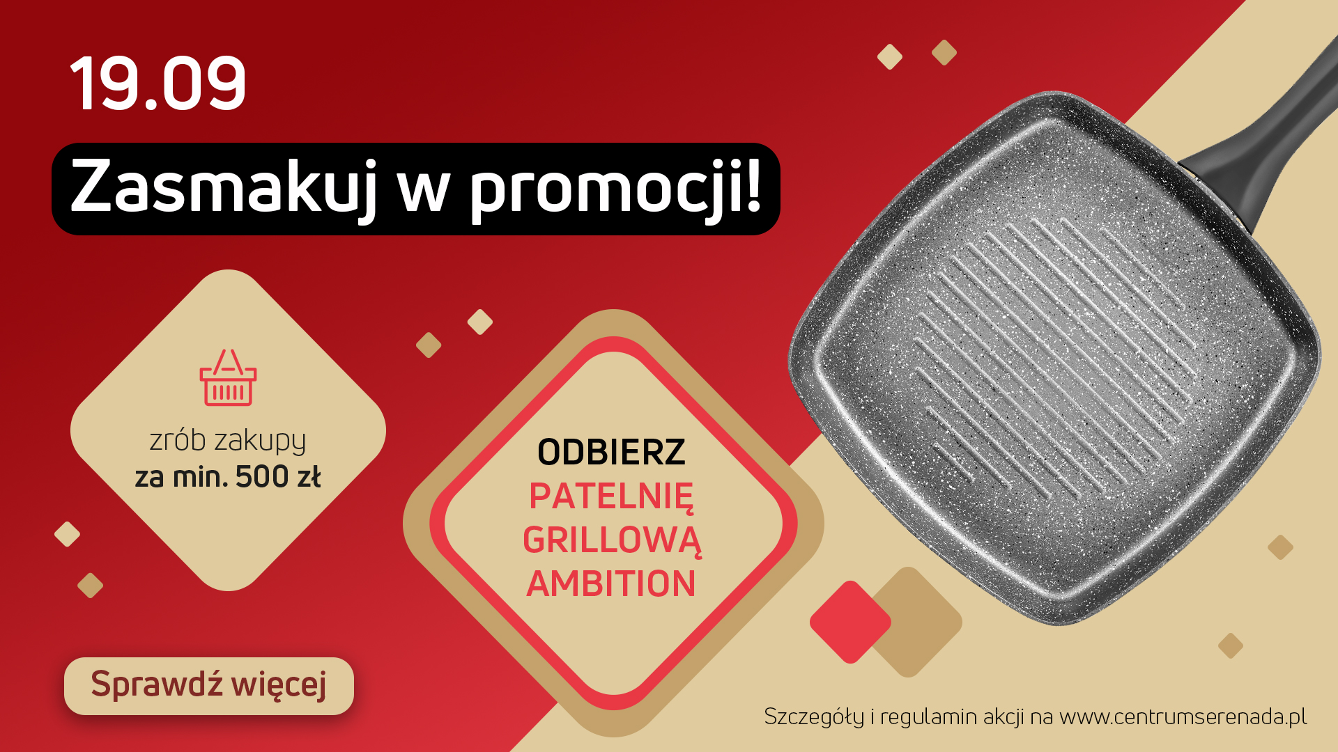 W najbliższą sobotę (19 września) klienci Serenady będą mieli okazję skorzystać z wyjątkowej oferty. Po okazaniu paragonów na kwotę minimum 500 zł będą mogli odebrać patelnię grillową marki Ambition, przystosowaną do używania na wszystkich typach kuchenek, w tym indukcyjnych.
