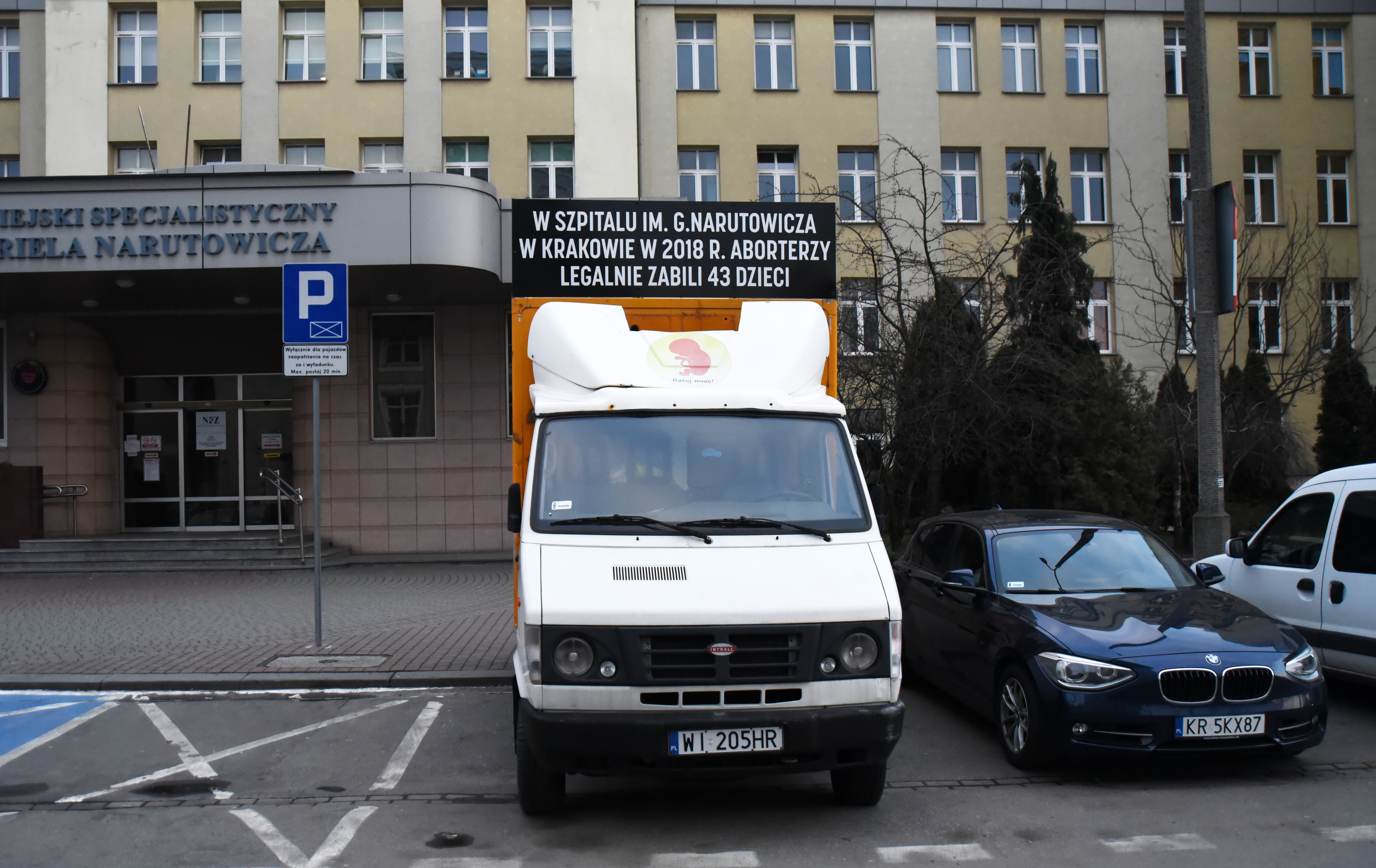 Na stojącej przed szpitalem Narutowicza furgonetce zamieszczono zdjęcie z zakrwawionym płodem i napis "W szpitalu im. G. Narutowicza w Krakowie w 2018 roku aborterzy legalnie zabili 43 dzieci. Przeciwko prezentowaniu drastycznych treści protestowalo wielu krakowian. Teraz znalazł się sposób, by zmusić działaczy pro-life, by zabrali furgonetkę.