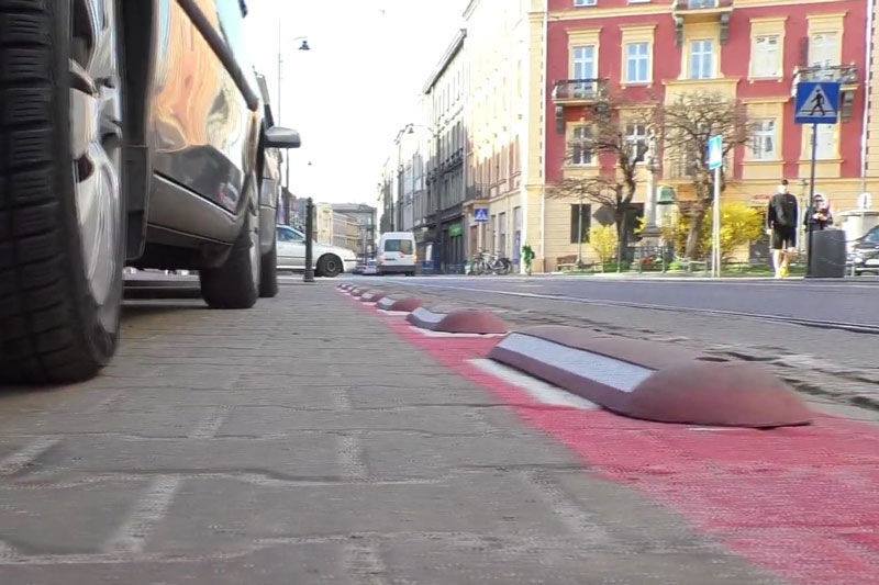 Oprócz gumowych ograniczników wyczuwalnych przez parkujących kierowców pod kołami, na jezdni malowane są rzucające się w oczy biało-czerwone pasy.