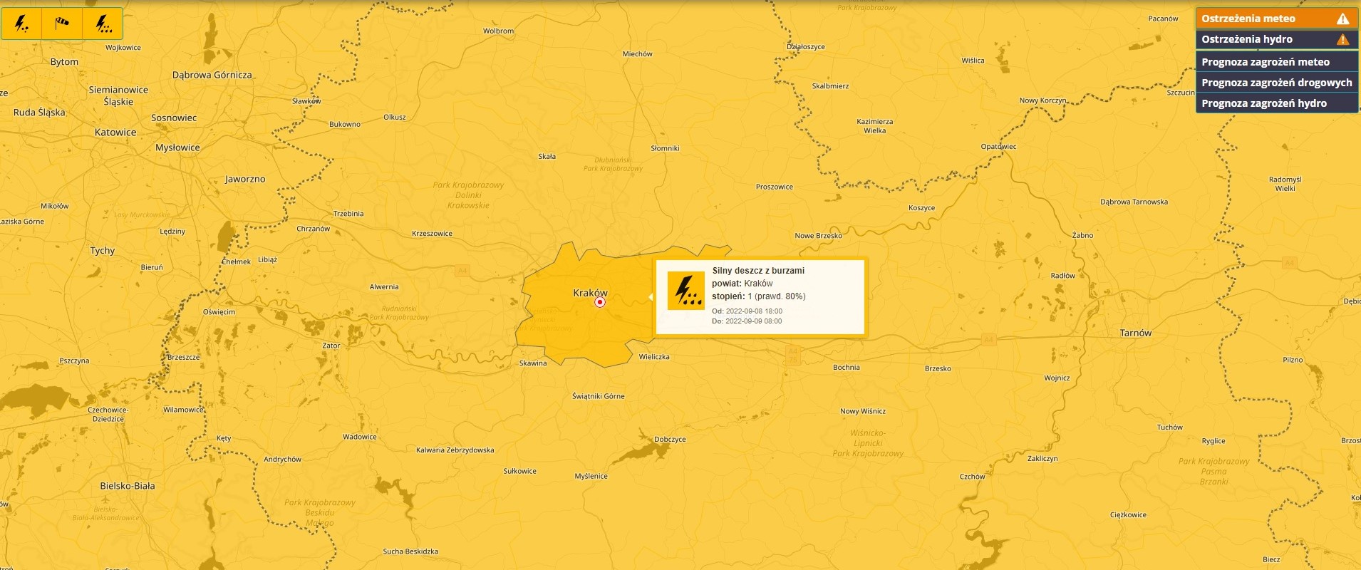 Synoptycy Instytutu Meteorologii i Gospodarki Wodnej wydali ostrzeżenie pierwszego stopnia dla Małopolski. Obowiązuje ono od dziś, 8 września, od godz. 18 do jutra, 9 września, do 8 rano.