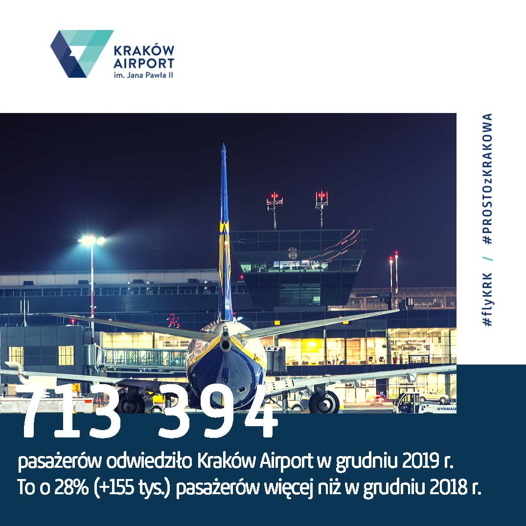 W grudniu z usług krakowskiego lotniska skorzystało 713 394 pasażerów, to 28% wzrost w stosunku do grudnia 2018 roku, czyli o 155 000 więcej pasażerów. Łącznie od początku 2019 roku obsłużono 8 410 817 pasażerów, czyli o 1 641 tyś. więcej niż w analogicznym okresie poprzedniego roku. To absolutny rekord w historii krakowskiego lotniska.