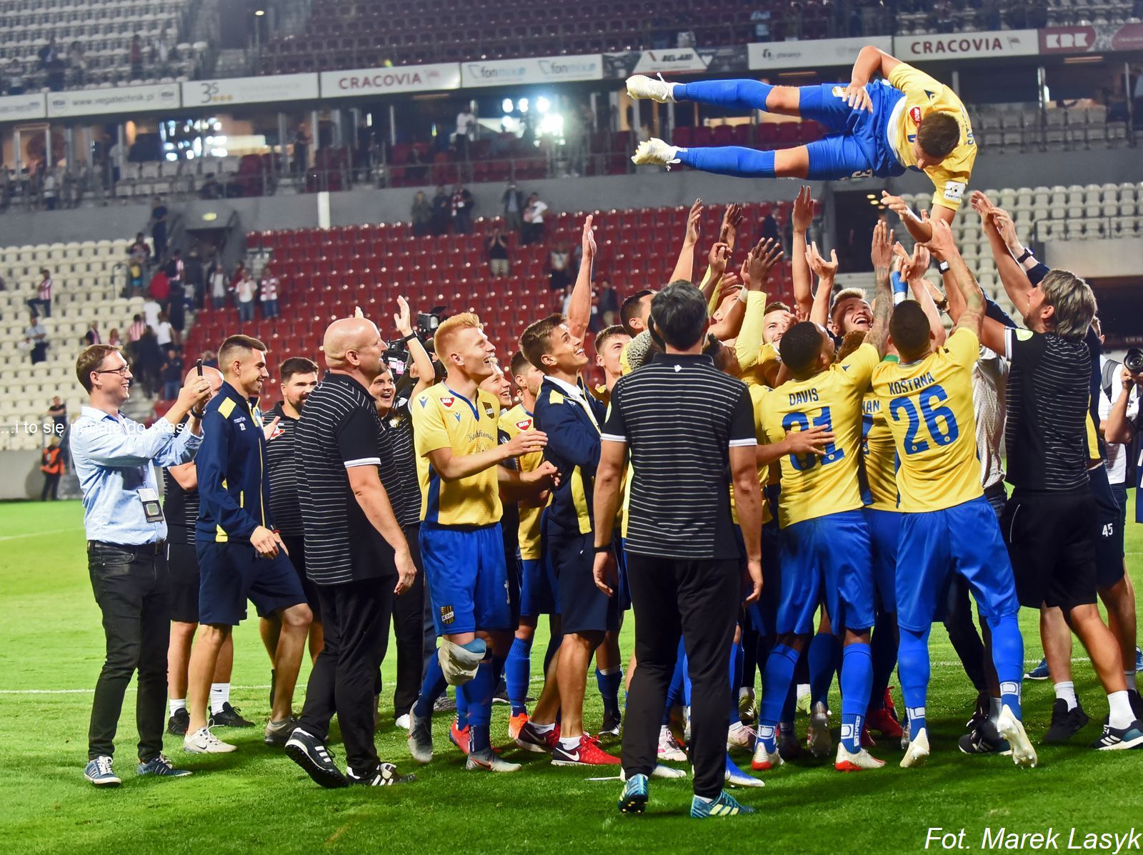 Mecz eliminacyjny pierwszej rundy kwalifikacyjnej Ligi Europy Cracovia Krakow - DAC Dunajska Streda 2:2. N/z Radość zespołu i kibiców DAC Dunajska Streda po zakwalifikowaniu się do drugiej rundy.