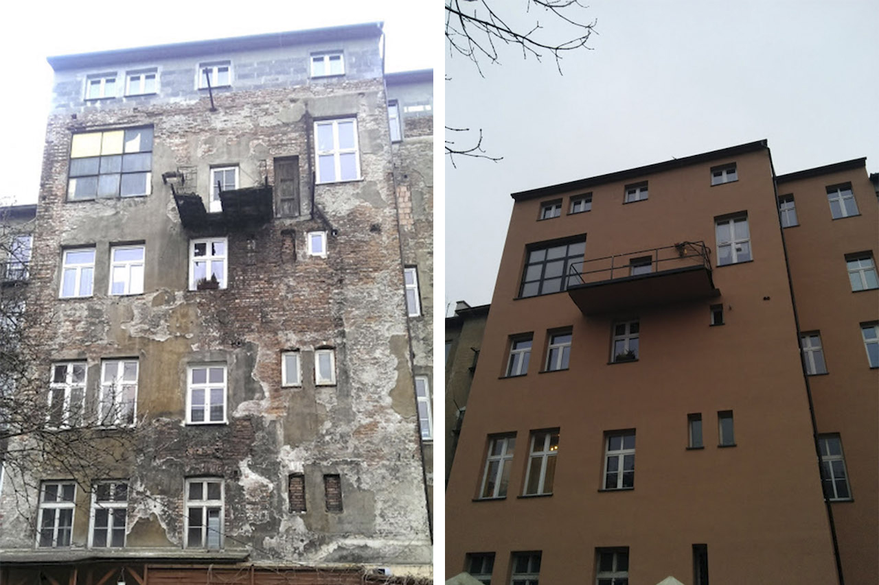 Budynek od strony elewacji był w naprawdę opłakanym stanie, więc zależało nam na tym, żeby go odświeżyć. Podczas remontów, zawsze staramy się zrobić jak najwięcej i jak najlepiej. Mieliśmy nieco szczęścia, bo administracja przystała na nasz pomysł bardzo chętnie. Umówiliśmy się więc po prostu, że sami wszystko załatwimy. Znaleźliśmy ekipę, uzgodniliśmy warunki i szczegóły, dogadaliśmy się w kwestii ceny i... niedługo potem roboty ruszyły. Skorzystaliśmy przy okazji z rusztowania, dzięki temu dużo sprawniej odrestaurowaliśmy balkon.